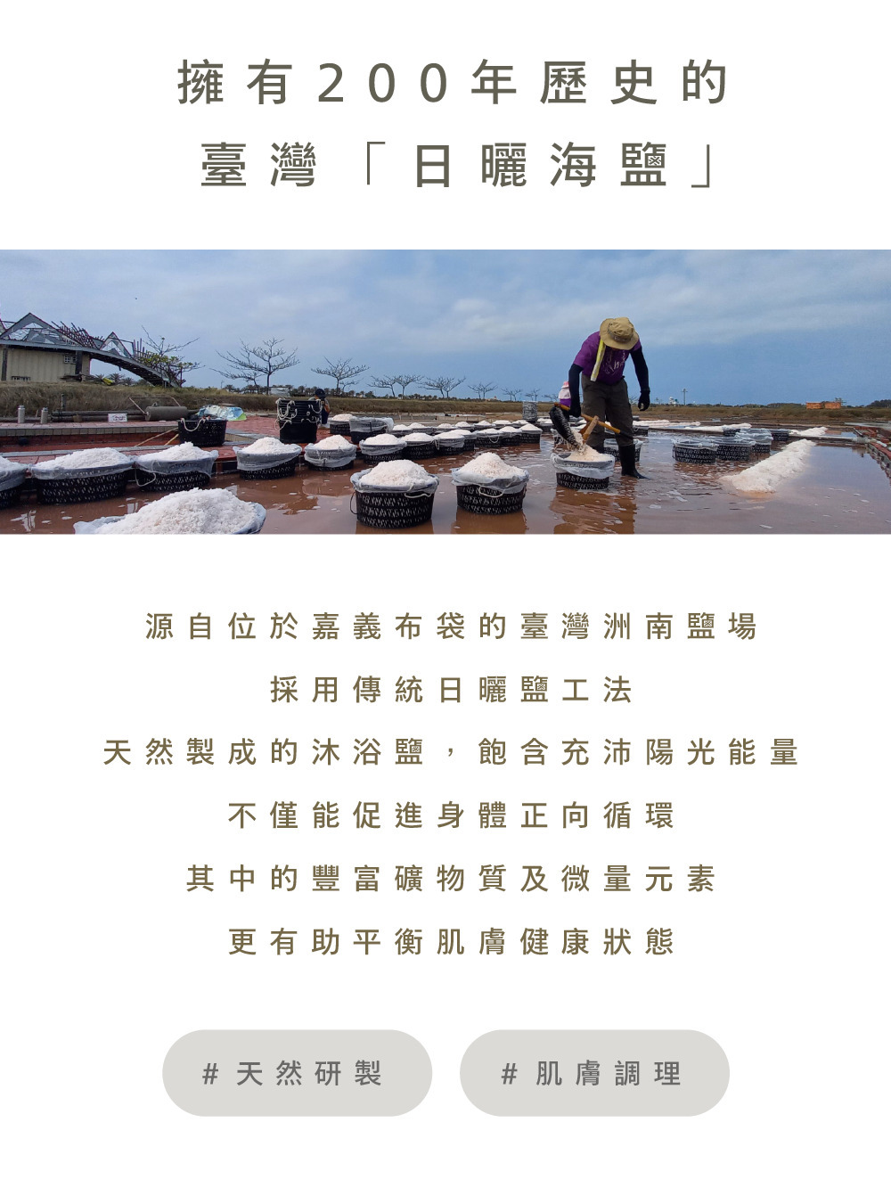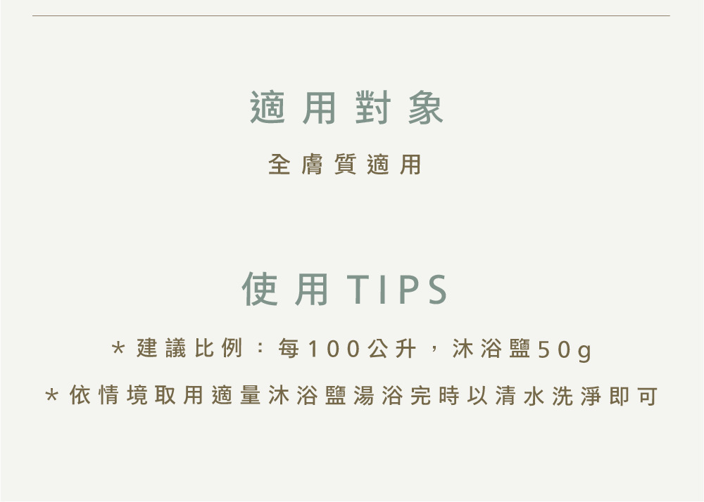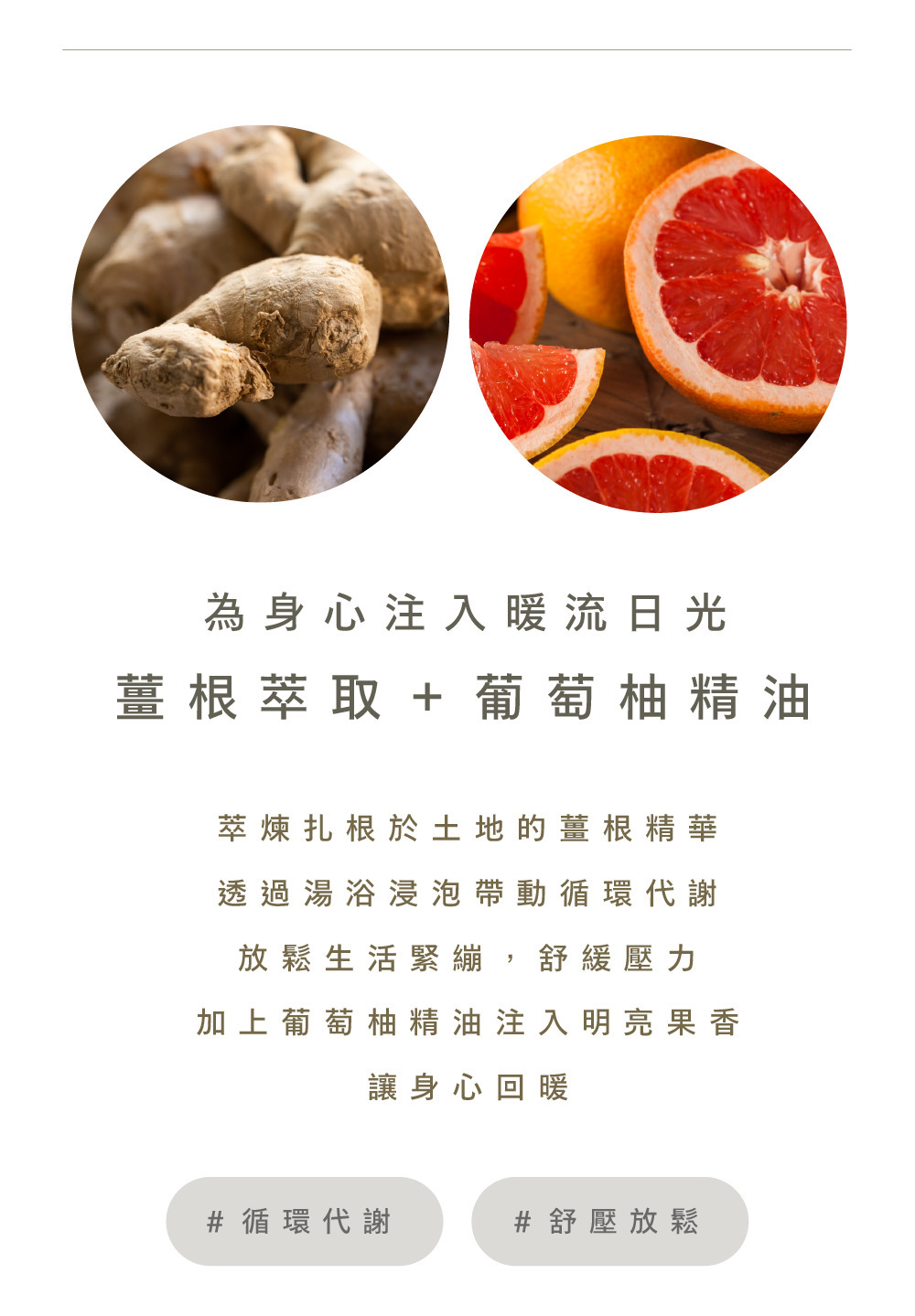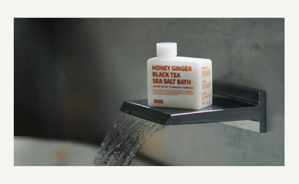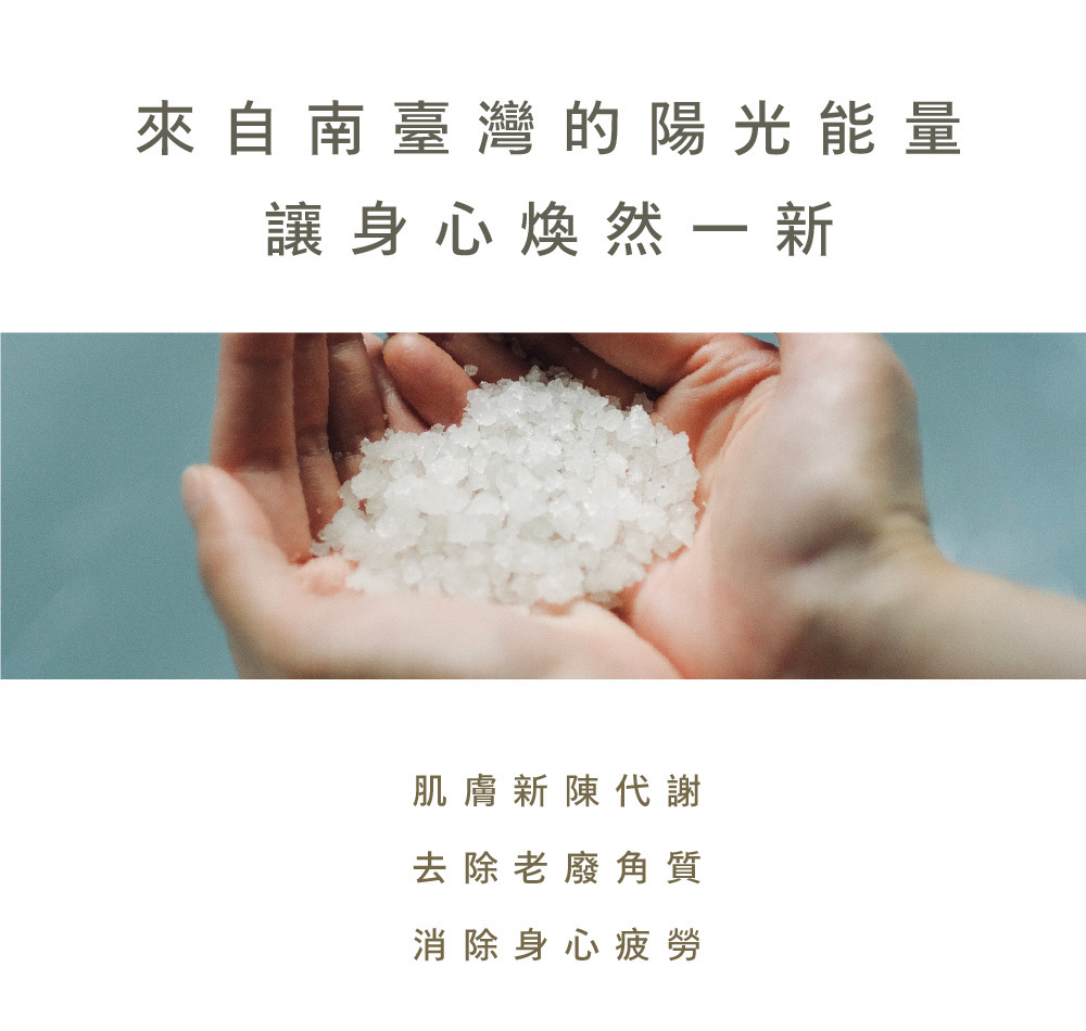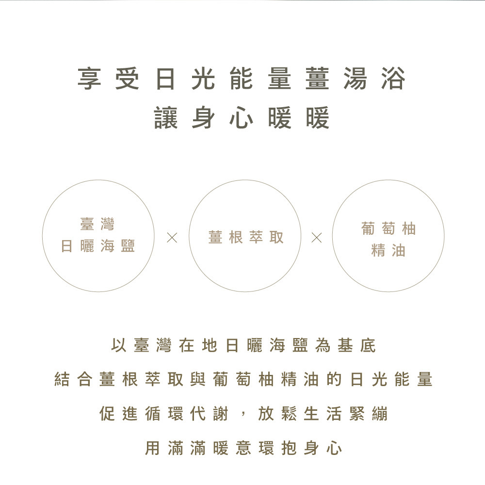 以臺灣在地日曬海鹽為基底,結合薑根萃取與葡萄柚精油的日光能量,促進循環代謝,放鬆生活緊繃,用滿滿暖意環抱身心。