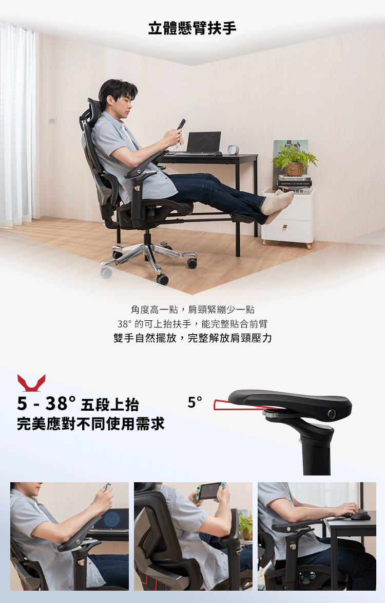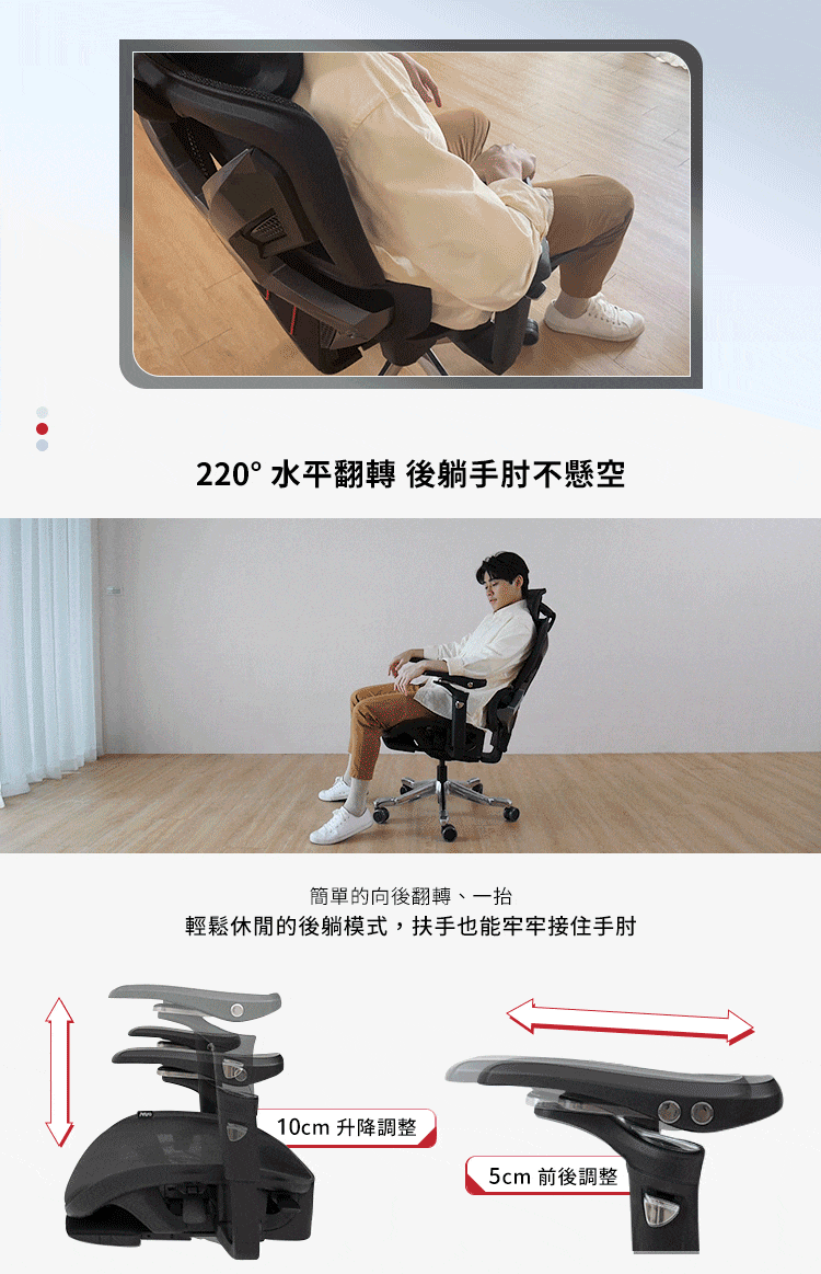 5D多段式調節扶手(上下、左右、前後、上掀旋轉、後旋收納),各種角度操縱自如。