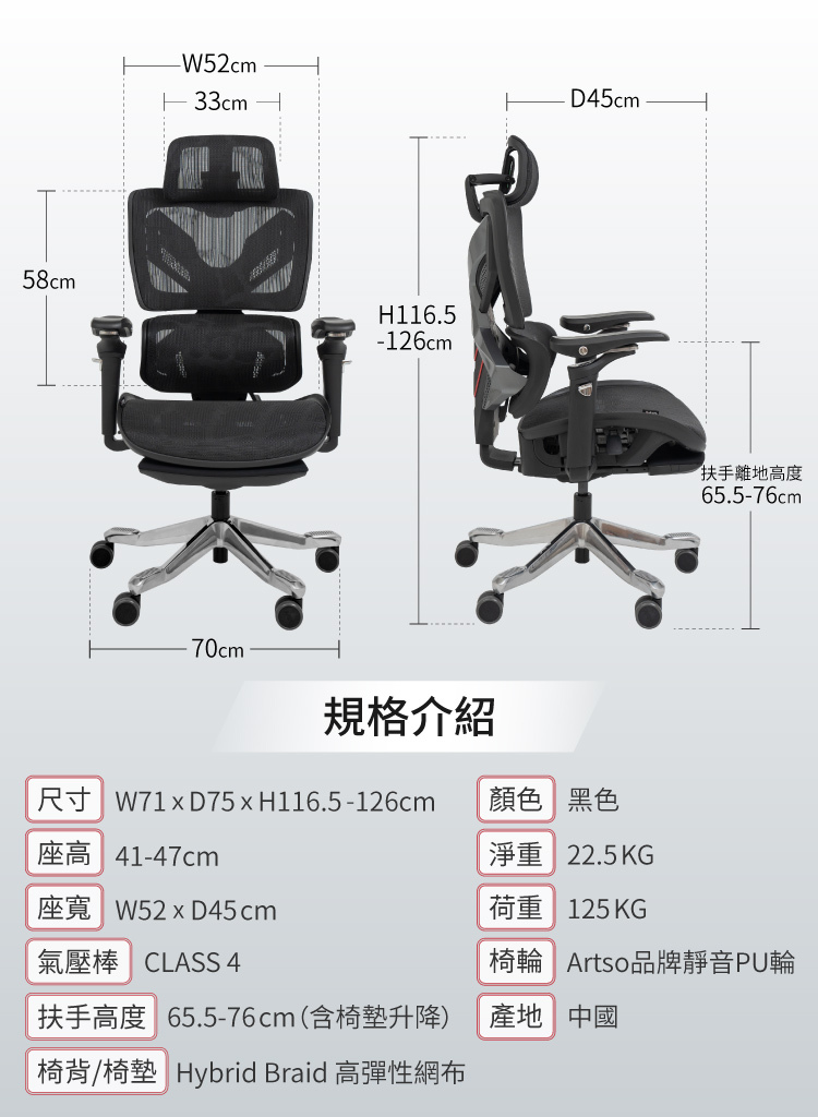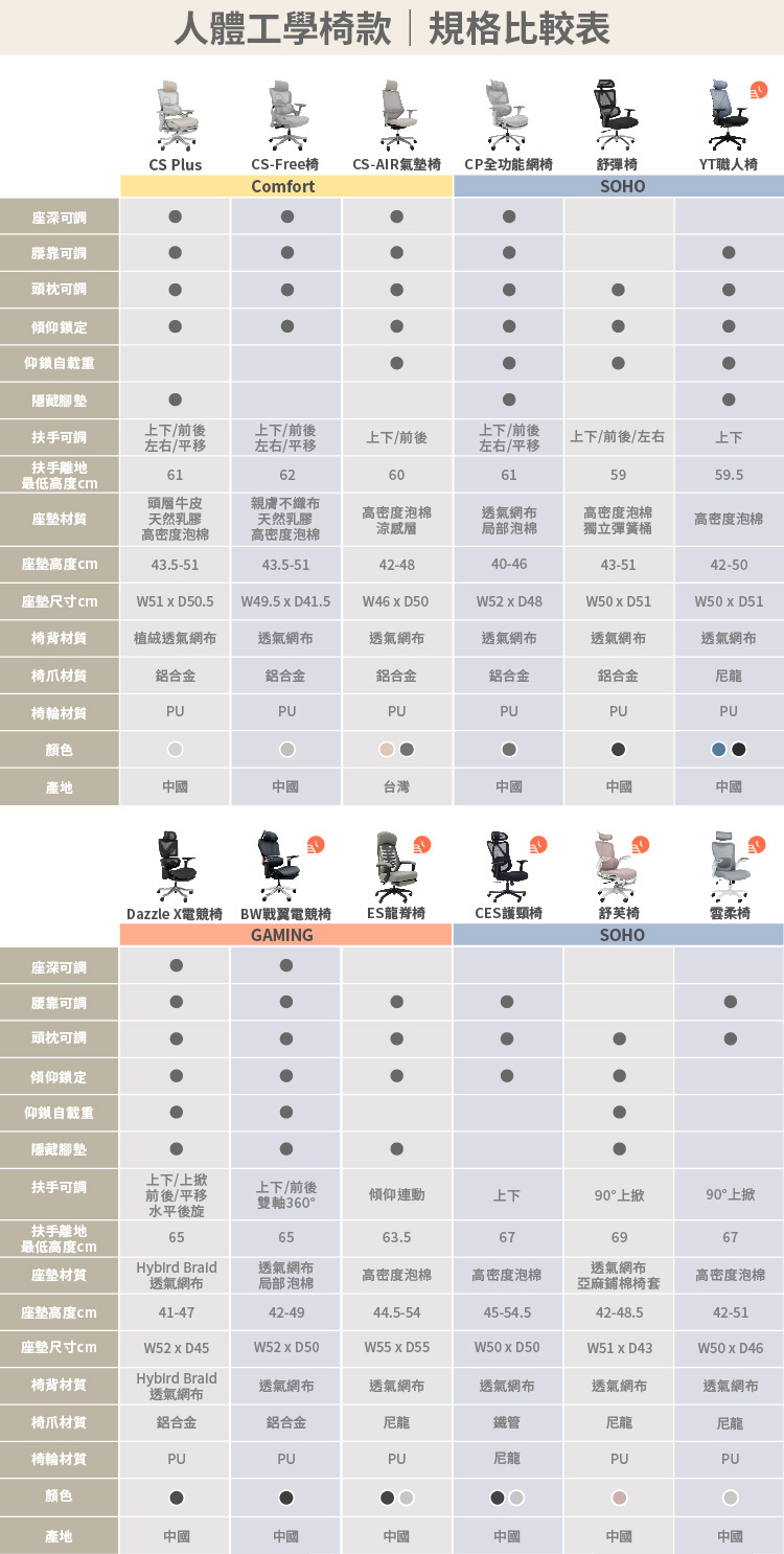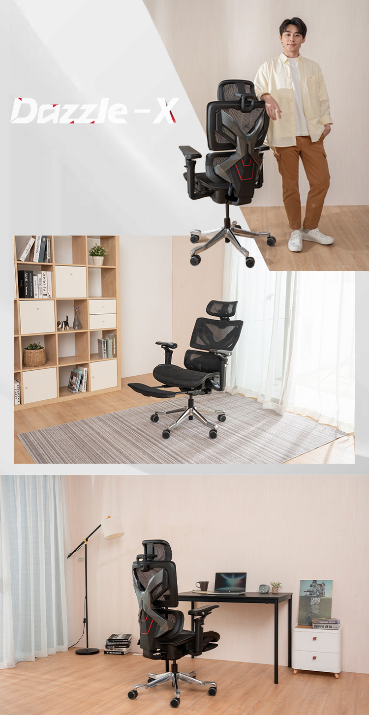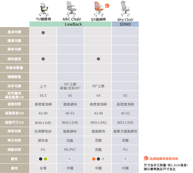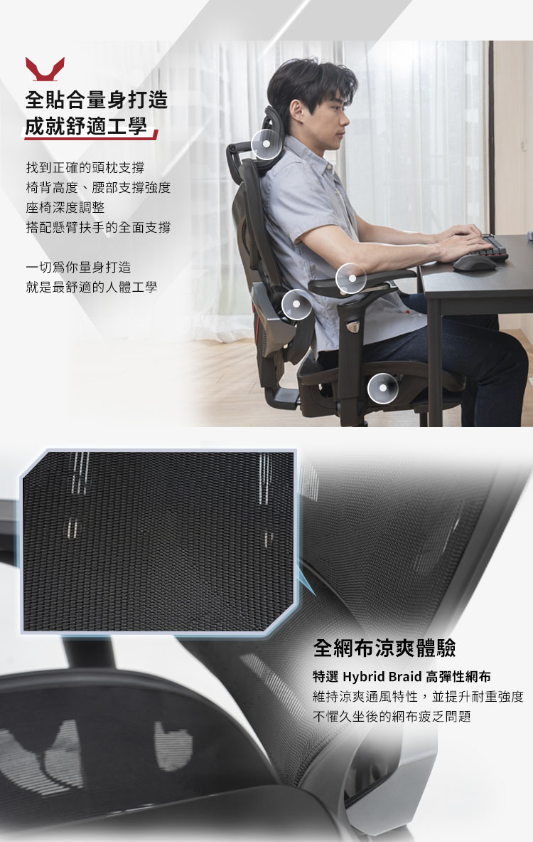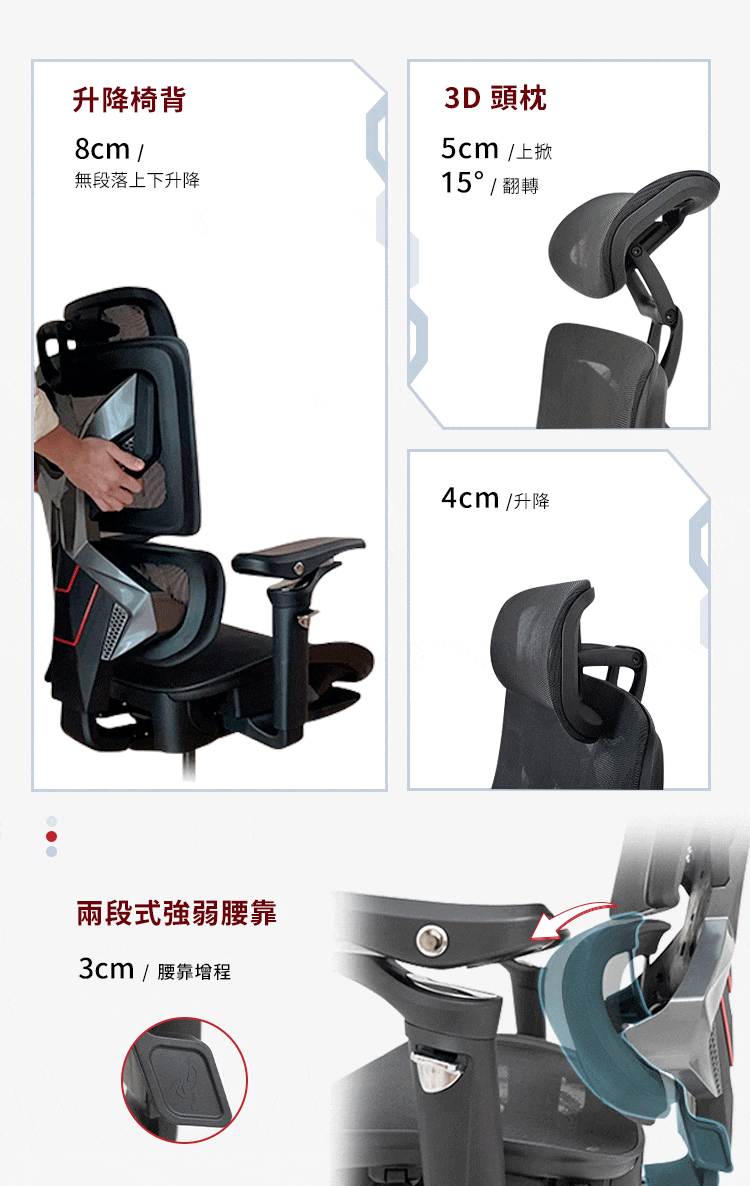 腰背分離網布椅背,椅背高度4段調整。