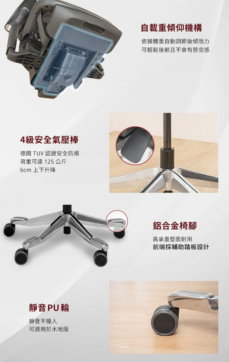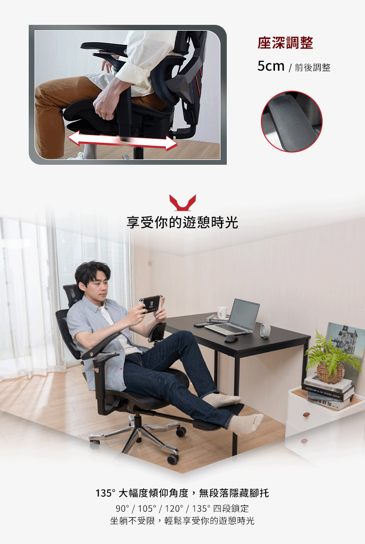 自載重傾仰機構,最大135度傾躺,可自由調整傾仰角度,也可以4個角度鎖定。