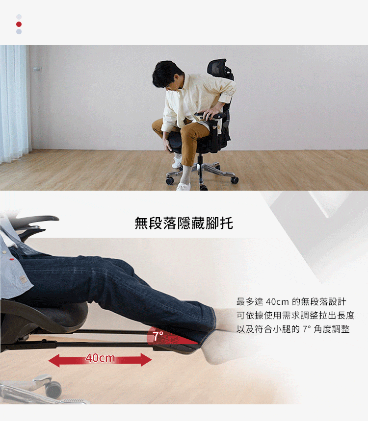 無段落伸縮式隱藏腳托,收納不卡腳,具彈性緩衝紓壓雙腿。