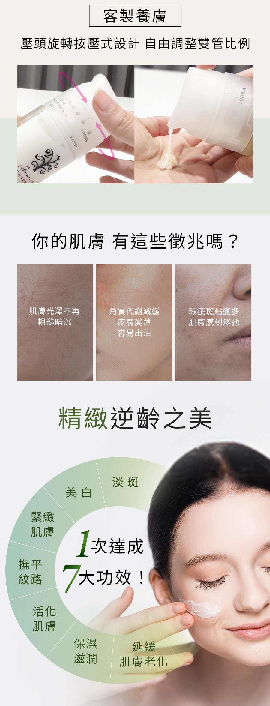 • 一次達成7大功效!淡斑、美白、緊緻肌膚、撫平紋路、活化肌膚、保濕滋潤、延緩肌膚老化