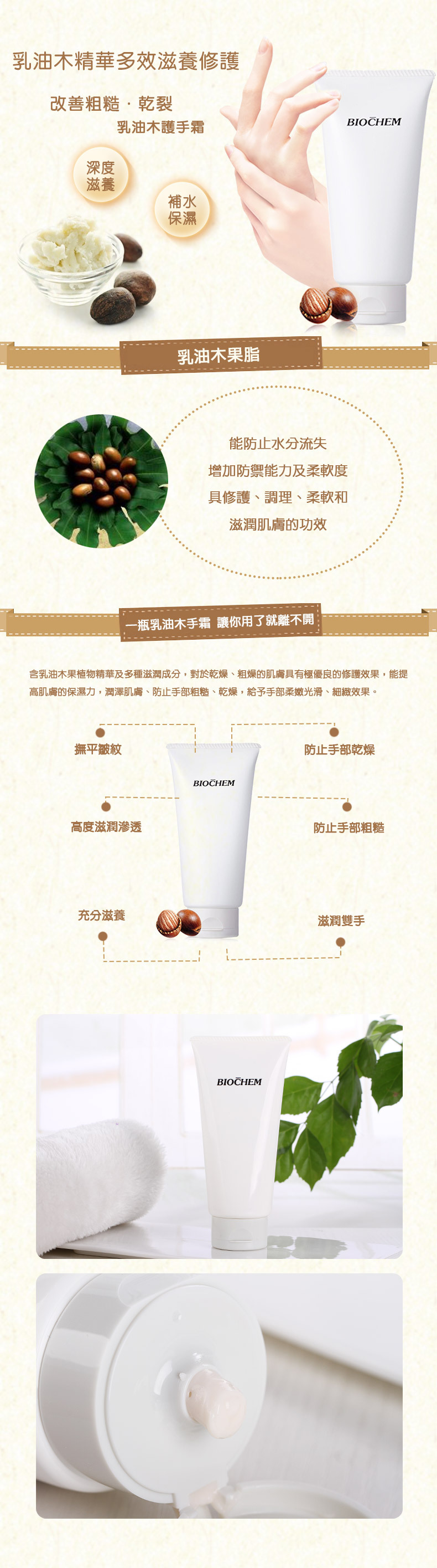 乳油木精華多效滋養修護 撫平皺紋、高度滋潤滲透、充分滋養 防止手部乾燥、防止手部粗糙、滋潤雙手