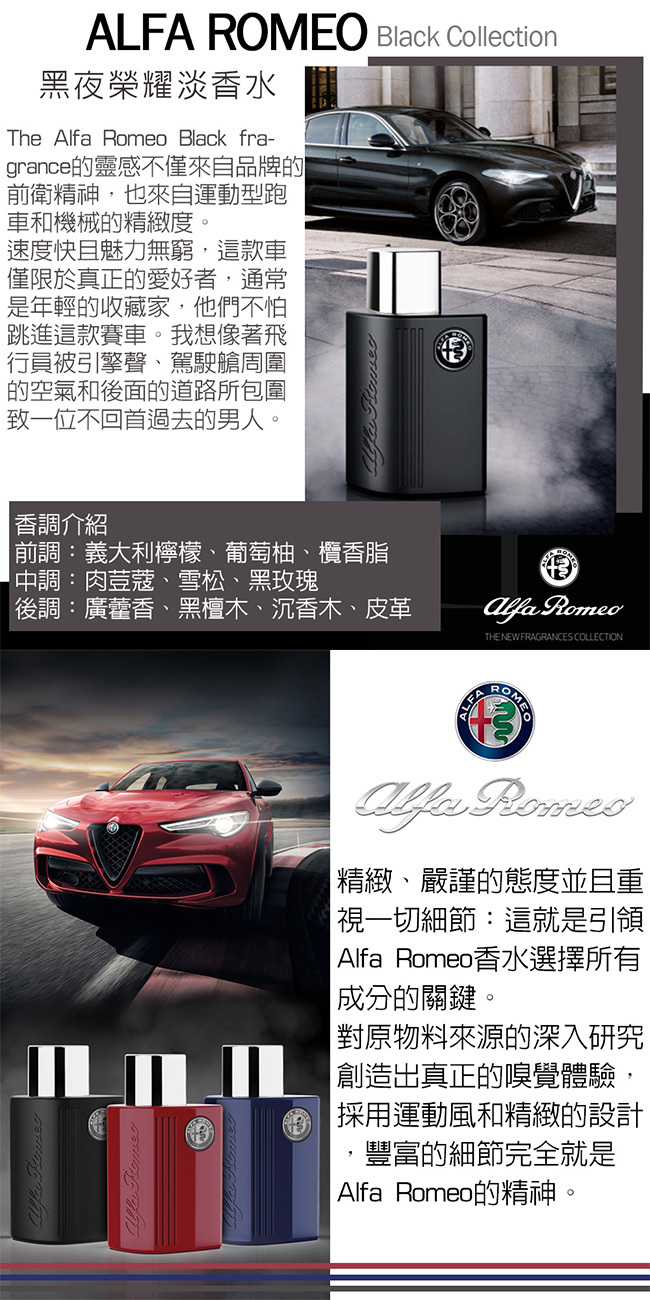 The Alfa Romeo Black fragrance的靈感不僅來自品牌的前衛精神,也來自運動型跑車和機械的精緻度。