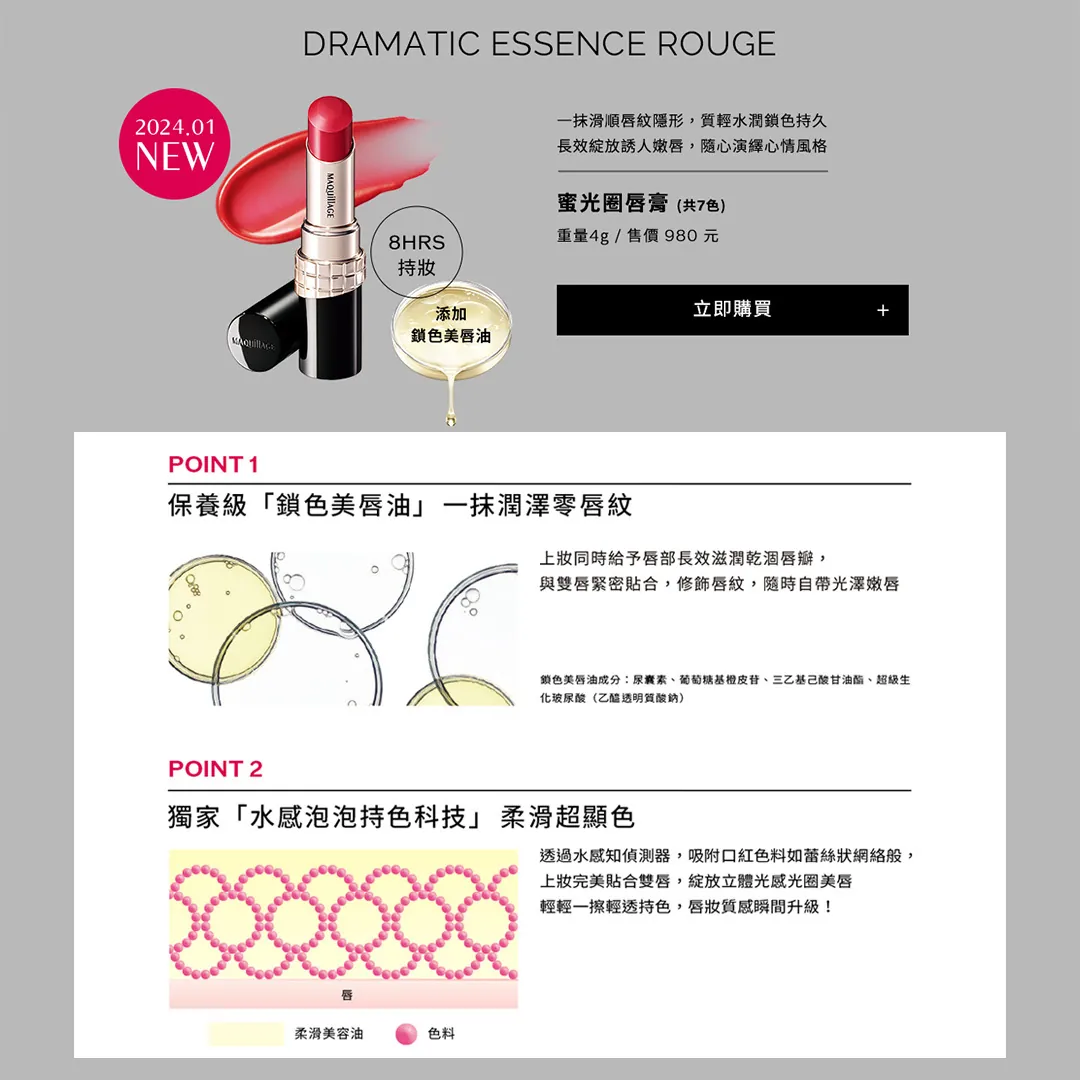 實現澎潤光澤粧效,輕盈亮澤珍珠光,三重色彩技術,6小時潤澤及持粧效果實證