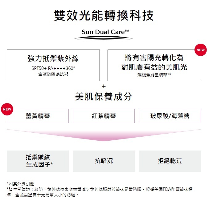 添加螺旋藻能量精華,將有害陽光UVA/UVB轉化為對肌膚有益的美肌光。
